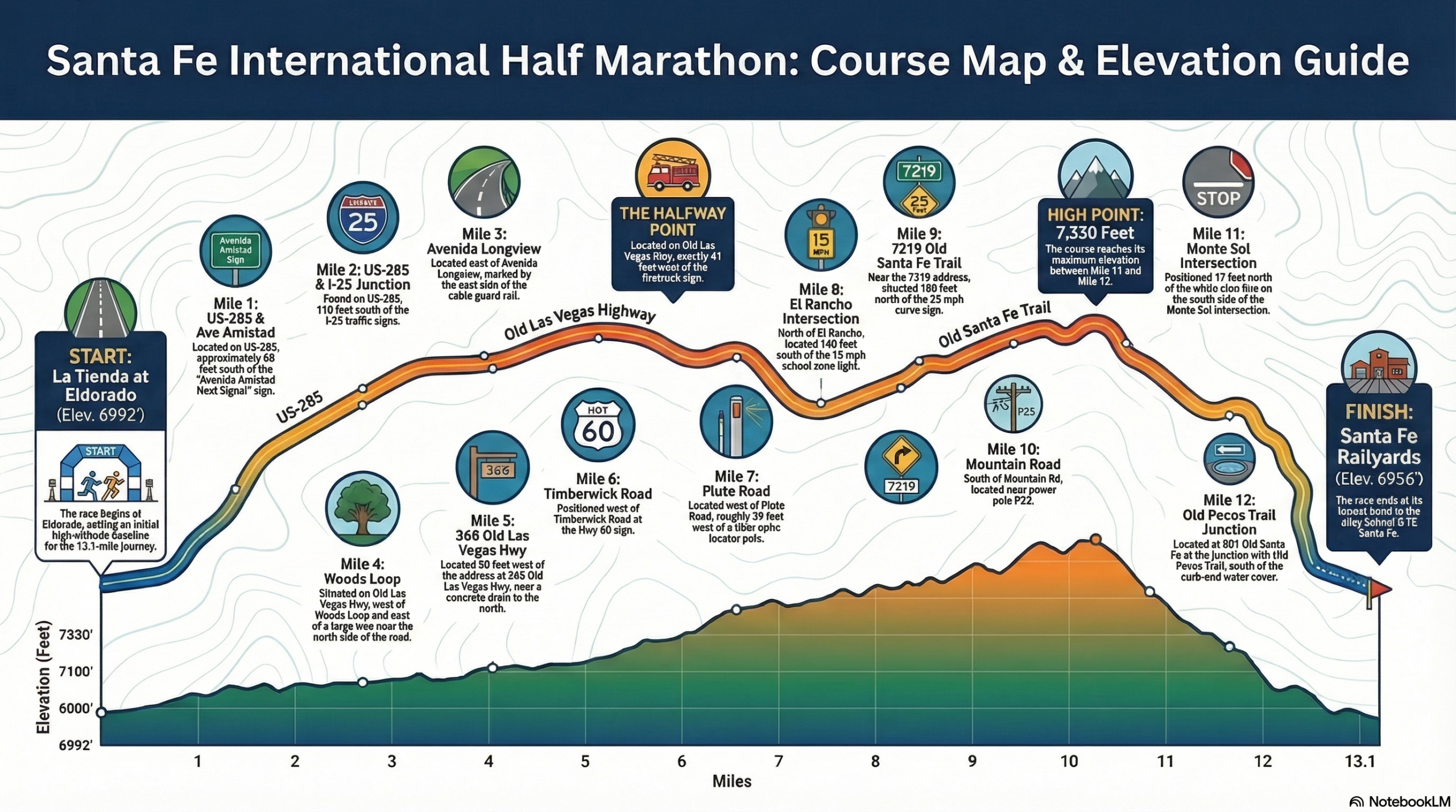 The half marathon course takes runners through some of Santa Fe’s most iconic and picturesque areas, including: