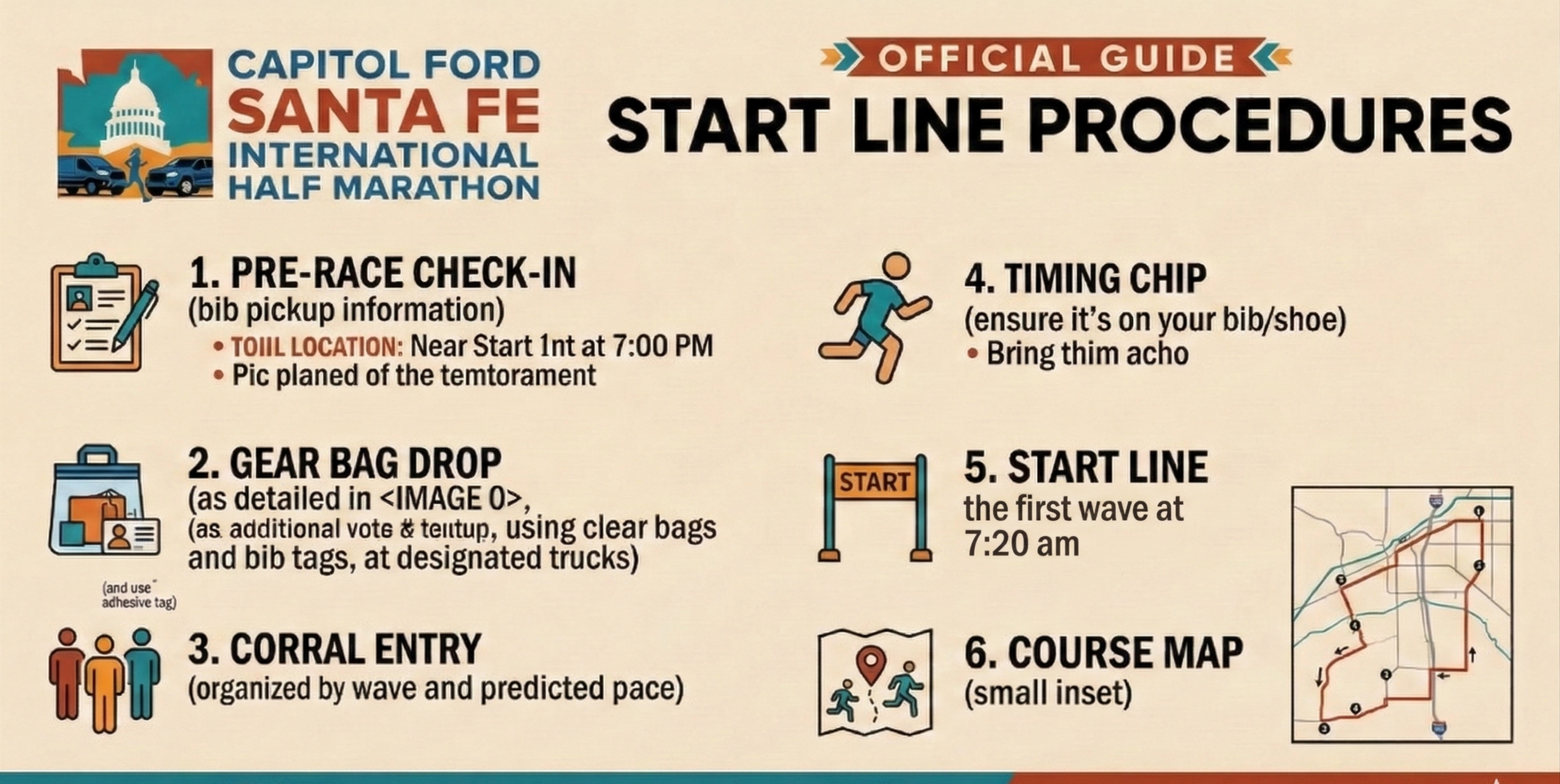 The Capitol Ford Santa Fe International Half Marathon begins at high altitude and in crisp early‑morning temperatures. These procedures help every runner start warm, organized, and ready for the journey ahead.